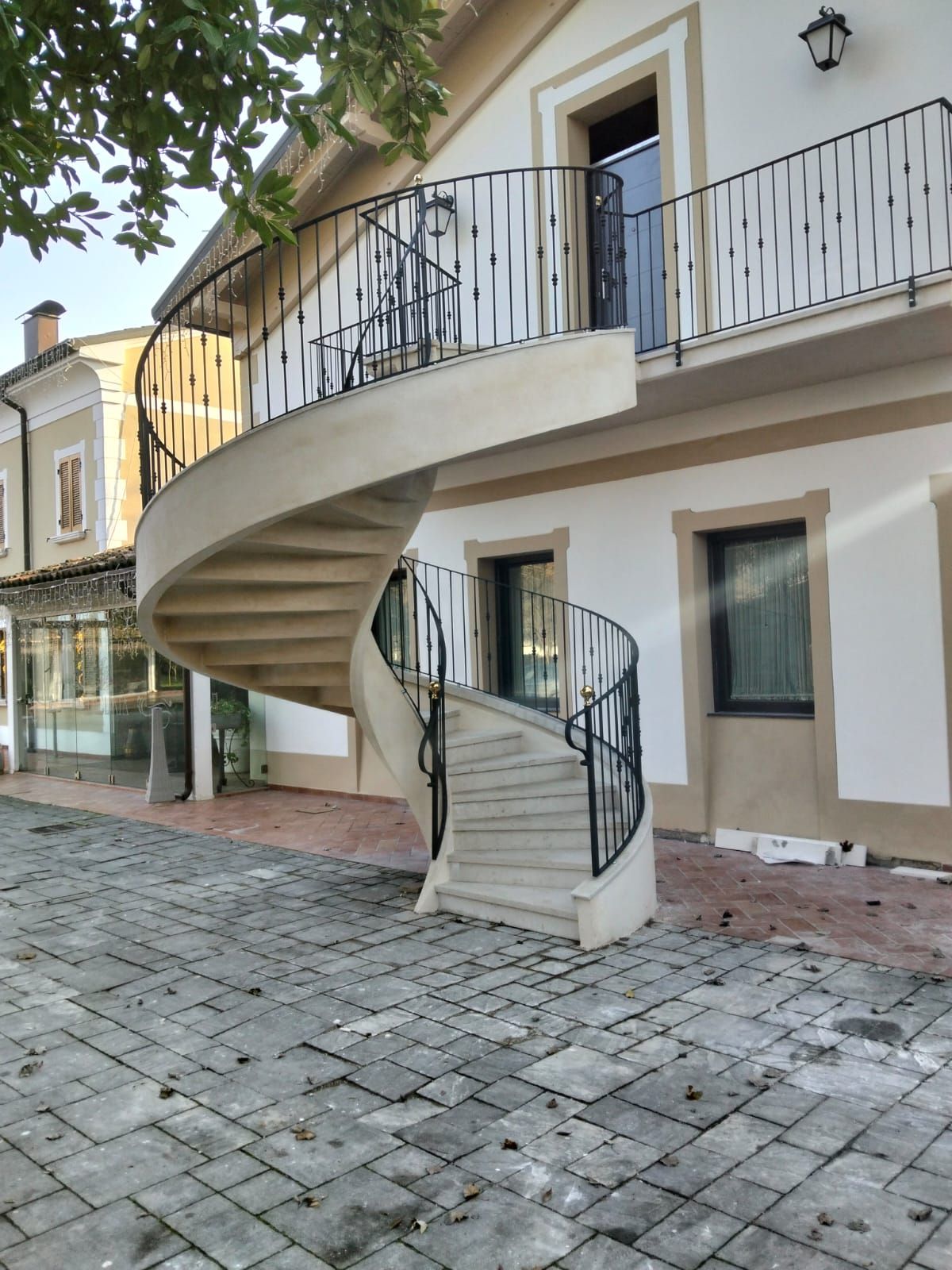 Scala elicoidale in cemento di diametro 320 cm , con rivestimento dei gradini in pietra della Lessinia e ringhiera in ferro verniciato. Installata presso Villa Fondo Tagliata, a Mirandola (Modena / www.villafondotagliata.com)